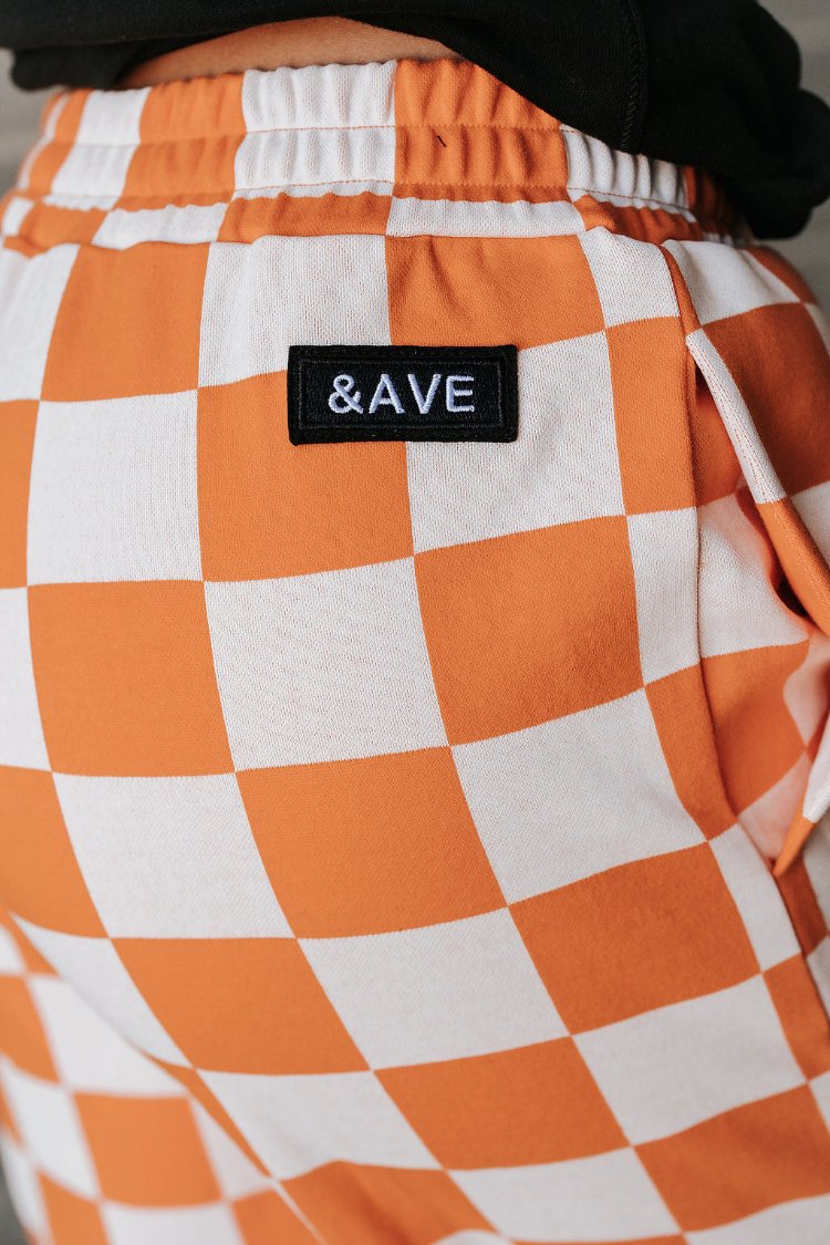 Get cozy and stylish with our Checkered Joggers - Pumpkin Spice by Ampersand Avenue. These joggers feature a charming orange and cream checkered pattern with a black &ave patch, perfect for adding a touch of autumn flair to your wardrobe.