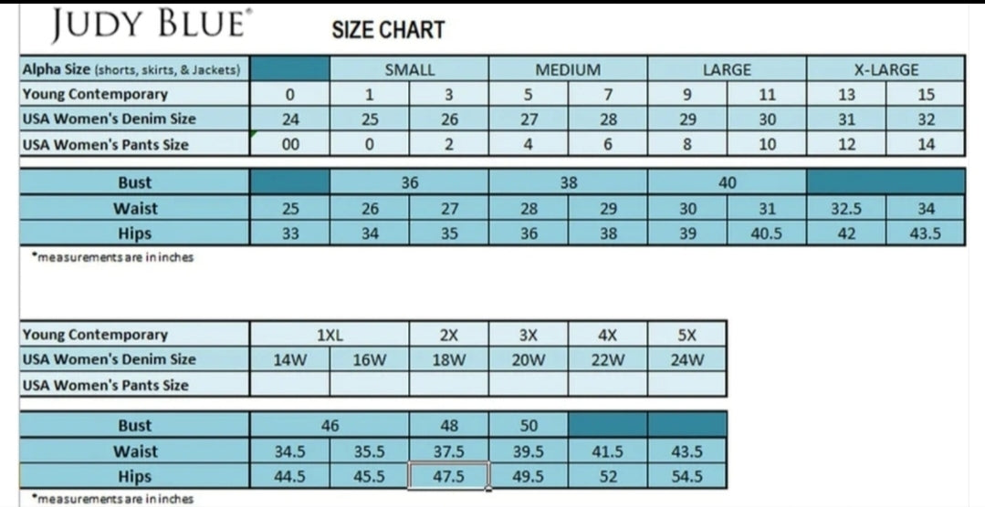 How the sizing works at Judy Blue: Take your lowest even size and round down to the nearest odd number. For example, if I am a 6/8, I would go with 6 and round down to 5 which is my Judy Blue size! Don't forget that Boyfriend cut always runs oversized so you can downsize if you'd like!
