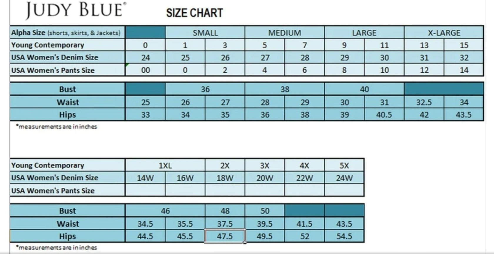 Judy Blues are now final sales as we clear out our inventory. Please review sizing charts when ordering or reach out for help!